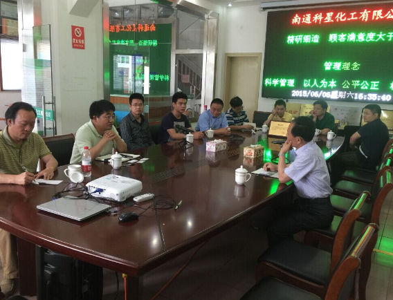2015年6月6日,中國(guó)新型建材設(shè)計(jì)研究院黨委書(shū)記、副院長(zhǎng)施存有先生(左一)、美國(guó)Meecotech納米技術(shù)首席技術(shù)官許之詠博士(左二)、中央“千人計(jì)劃”專(zhuān)家、南通科星化工有限公司技術(shù)總監(jiān)姜興茂教授(左五)在科星公司會(huì)議室與董事長(zhǎng)吳龍鐵先生就納米新材料及其它技術(shù)進(jìn)行廣泛交流。