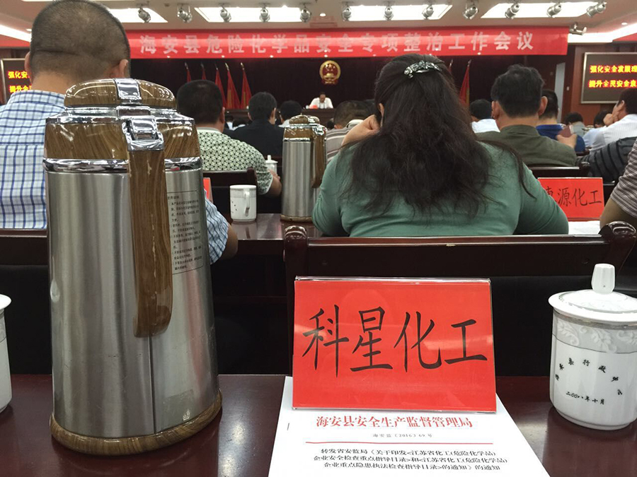 6月7日,海安縣危險(xiǎn)化學(xué)品安全專項(xiàng)工作會議在縣政府報(bào)告廳舉行。 南通科星化工有限公司董事長吳龍鐵親自參加會議。