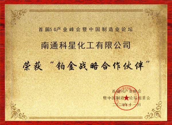 5G產業峰會暨中國制造業論壇組委會為南通科星化工有限公司授予“鉑金戰略合作伙伴”的榮譽。