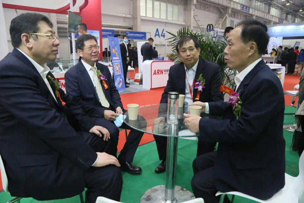 山東濰柴控股集團有限公司副總經理佟德輝(左一)、中原內配集團副總裁中原內配股份有限公司總經理黨增軍(左二)、中國內燃機協會副秘書長孫奎崧(右二)蒞臨南通科星化工有限公司展位與董事長吳龍鐵(右一)愉快交談
