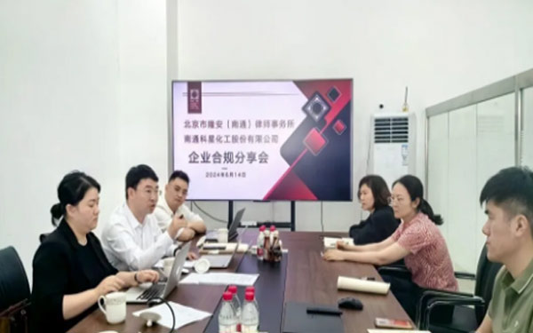 6月14日,北京市隆安(南通)律師事務所張銳律師一行來到科星進行企業合規分享交流活動。科星化工董事長吳龍鐵、總裁吳曉強、財務副總經理吳桂紅等公司高管參與上述活動。