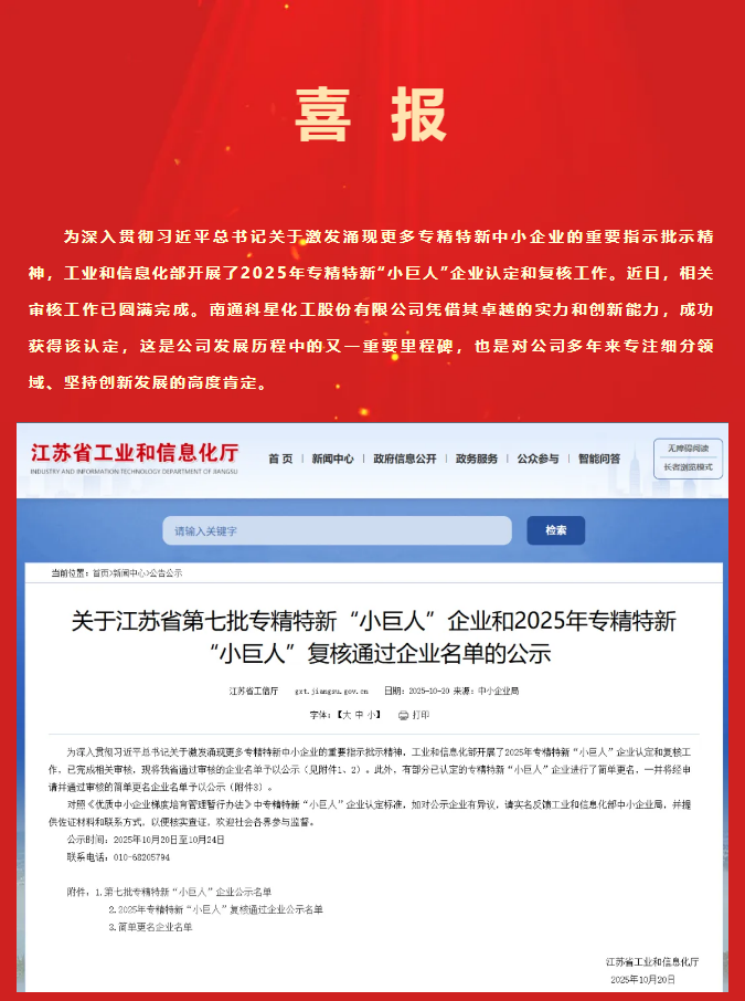 喜報(bào)!南通科星化工股份有限公司榮獲國家專精特新“小巨人”企業(yè)認(rèn)定