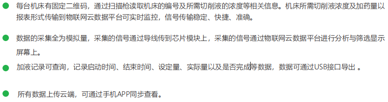 本系統通過掃碼槍讀取機床標號及所需要切削液數量等信息,系統定量給機床添加工作液并記錄時間,數量等數據,同時保存數據并上傳,本系統可移動、性能可靠、顯示直觀、操作簡單。